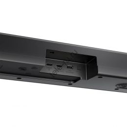 Саундбар выполнен в стильном черном цвете, что позволяет ему органично вписаться в любой интерьер. Корпус устройства изготовлен из прочных материалов, обеспечивая надежность и долговечность. Компактные размеры позволяют разместить его как на тумбе, так и повесить на стену, не занимая много места.